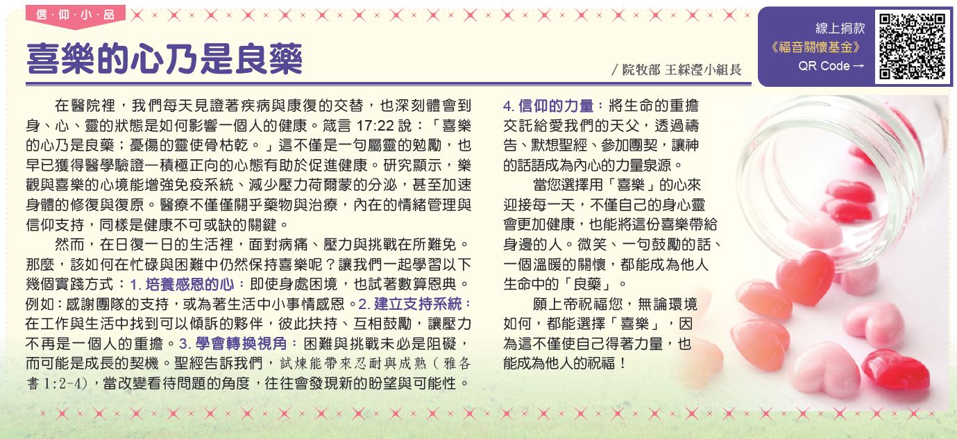 在醫院裡,我們每天見證著疾病與康復的交替,也深刻體會到身、心、靈的狀態是如何影響一個人的健康。箴言17:22說:「喜樂的心乃是良藥;憂傷的靈使骨枯乾。」這不僅是一句屬靈的勉勵,也早已獲得醫學驗證—積極正向的心態有助於促進健康。研究顯示,樂觀與喜樂的心境能增強免疫系統、減少壓力荷爾蒙的分泌,甚至加速身體的修復與復原。醫療不僅僅關乎藥物與治療,內在的情緒管理與信仰支持,同樣是健康不可或缺的關鍵。