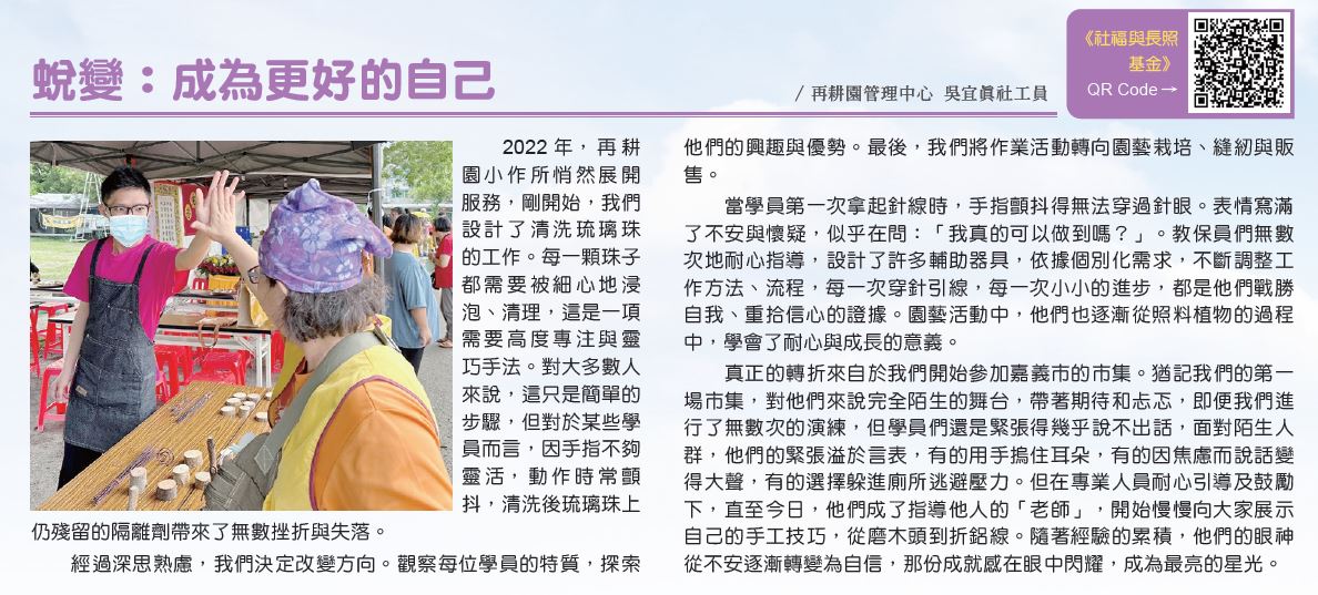 當學員第一次拿起針線時,手指顫抖得無法穿過針眼。表情寫滿了不安與懷疑,似乎在問:「我真的可以做到嗎?」。教保員們無數次地耐心指導,設計了許多輔助器具,依據個別化需求,不斷調整工作方法、流程,每一次穿針引線,每一次小小的進步,都是他們戰勝自我、重拾信心的證據。園藝活動中,他們也逐漸從照料植物的過程中,學會了耐心與成長的意義。