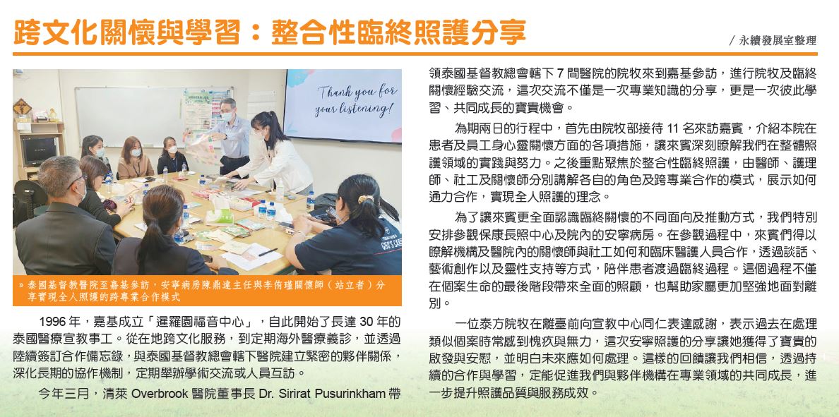 今年三月,清萊Overbrook醫院董事長Dr. Sirirat Pusurinkham帶領泰國基督教總會轄下7間醫院的院牧來到嘉基參訪,進行院牧及臨終關懷經驗交流,這次交流不僅是一次專業知識的分享,更是一次彼此學習、共同成長的寶貴機會。