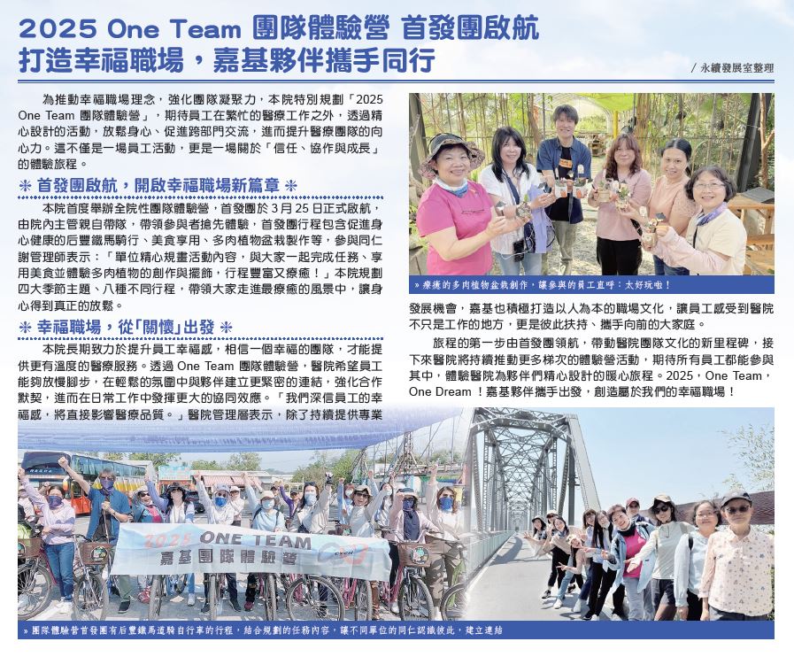 本院長期致力於提升員工幸福感,相信一個幸福的團隊,才能提供更有溫度的醫療服務。透過One Team 團隊體驗營,醫院希望員工能夠放慢腳步,在輕鬆的氛圍中與夥伴建立更緊密的連結,強化合作默契,進而在日常工作中發揮更大的協同效應。「我們深信員工的幸福感,將直接影響醫療品質。」醫院管理層表示,除了持續提供專業發展機會,嘉基也積極打造以人為本的職場文化,讓員工感受到醫院不只是工作的地方,更是彼此扶持、攜手向前的大家庭。