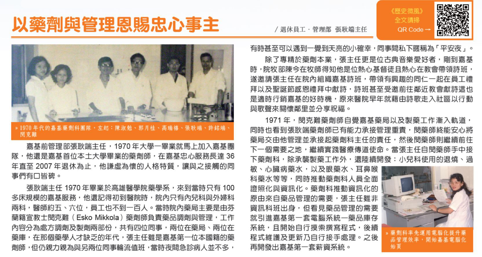 嘉基前管理部張耿端主任,1970年大學一畢業就馬上加入嘉基團隊,他還是嘉基首位本土大學畢業的藥劑師,在嘉基忠心服務長達36年直至2007年退休為止,他謙虛為懷的人格特質,讓與之接觸的同事們有口皆碑。