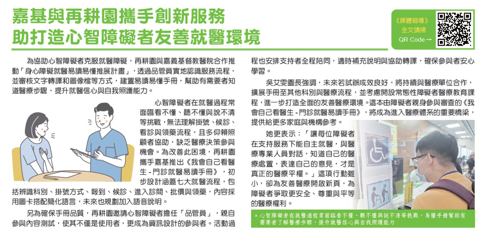 為協助心智障礙者克服就醫障礙,再耕園與嘉義基督教醫院合作推動「身心障礙就醫易讀易懂推展計畫」,透過品管員實地認識服務流程,並審核文字轉譯和圖像檔等方式,建置易讀易懂手冊,幫助有需要者知道醫療步驟,提升就醫信心與自我照護能力。
