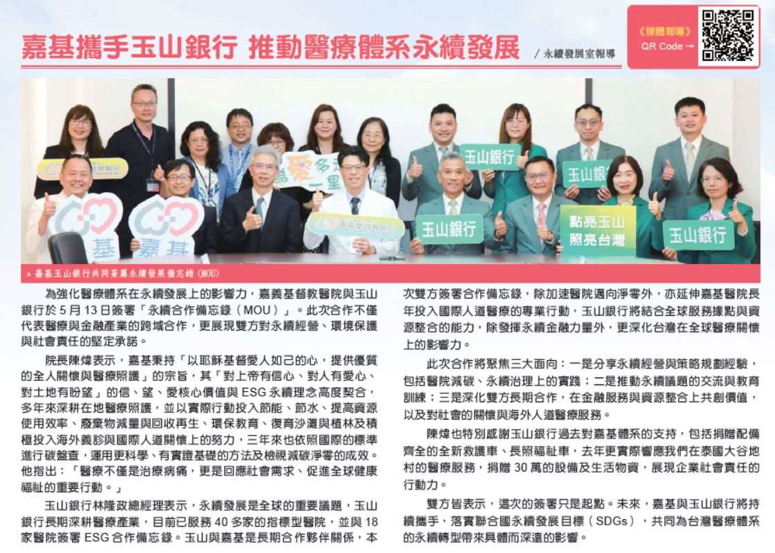 為強化醫療體系在永續發展上的影響力,嘉義基督教醫院與玉山銀行於5月13日(下午)簽署「永續合作備忘錄(MOU)」。此次合作不僅代表醫療與金融產業的跨域合作,更展現雙方對永續經營、環境保護與社會責任的堅定承諾。