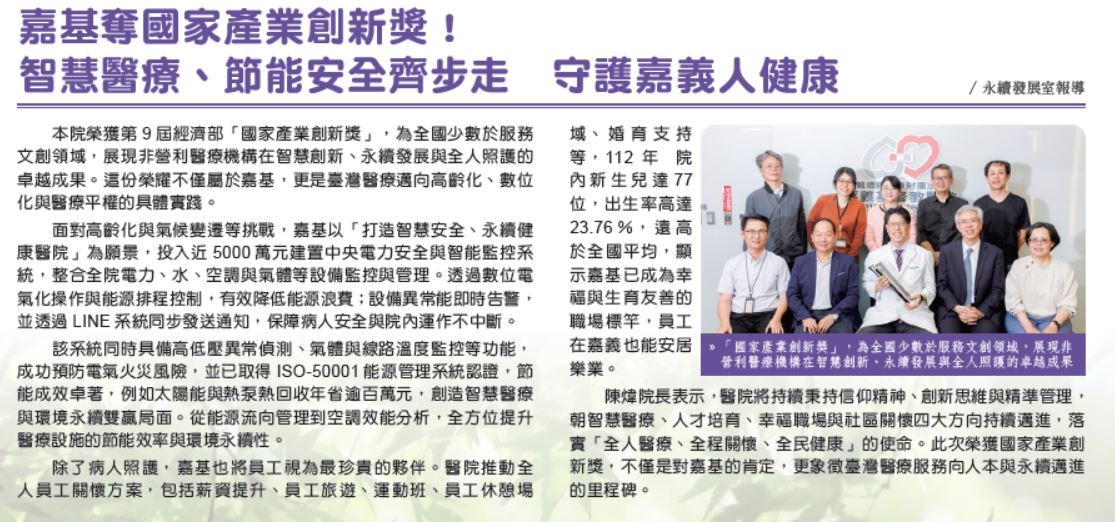 戴德森醫療財團法人嘉義基督教醫院榮獲第9屆經濟部「國家產業創新獎」,為全國少數於服務文創領域,展現非營利醫療機構在智慧創新、永續發展與全人照護的卓越成果。這份榮耀不僅屬於嘉基,更是臺灣醫療邁向高齡化、數位化與醫療平權的具體實踐。