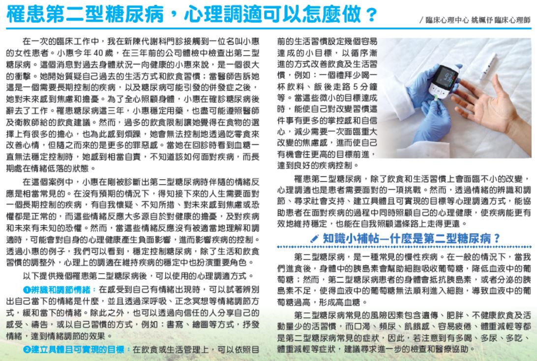 罹患第二型糖尿病,除了飲食和生活習慣上會面臨不小的改變,心理調適也是患者需要面對的一項挑戰。然而,透過情緒的辨識和調節、尋求社會支持、建立具體且可實現的目標等心理調適方式,能協助患者在面對疾病的過程中同時照顧自己的心理健康,使疾病能更有效地維持穩定,也能在自我照顧這條路上走得更遠。