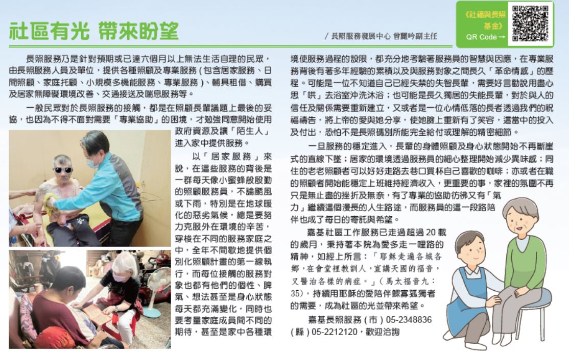 嘉基社區工作服務已走過超過20載的歲月,秉持著本院為愛多走一哩路的精神,如經上所言:「耶穌走遍各城各鄉,在會堂裡教訓人,宣講天國的福音,又醫治各樣的病症。」(馬太福音九:35),持續用耶穌的愛陪伴鰥寡孤獨者的需要,成為社區的光並帶來希望。