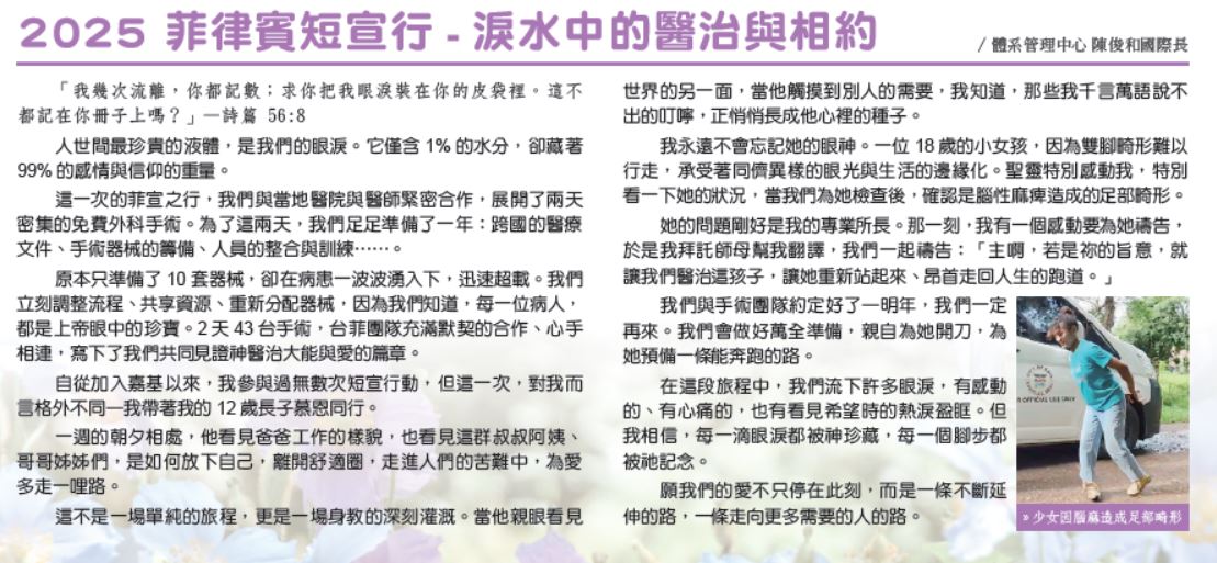 人世間最珍貴的液體,不是鑽石的溶劑,也不是黃金的熔流,而是我們的眼淚。它僅含1%的水分,卻藏著99%的感情與信仰的重量。當我們走進菲律賓鄉間,看見一位位因病苦困頓、因資源匱乏而陷入無助的弟兄姊妹,我們的心像是被重重攥了一下。擦乾眼淚的手,隨即又接過手術刀與繃帶,因為我們知道:如果這一滴眼淚能成為神的回應,願我們的淚水就流在祂的皮袋裡,成為祂冊子中醫治的記號。