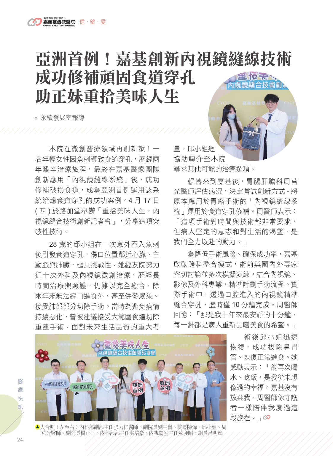 亞洲首例 嘉基創新內視鏡縫線技術 成功修補頑固食道穿孔 助正妹重拾美味人生