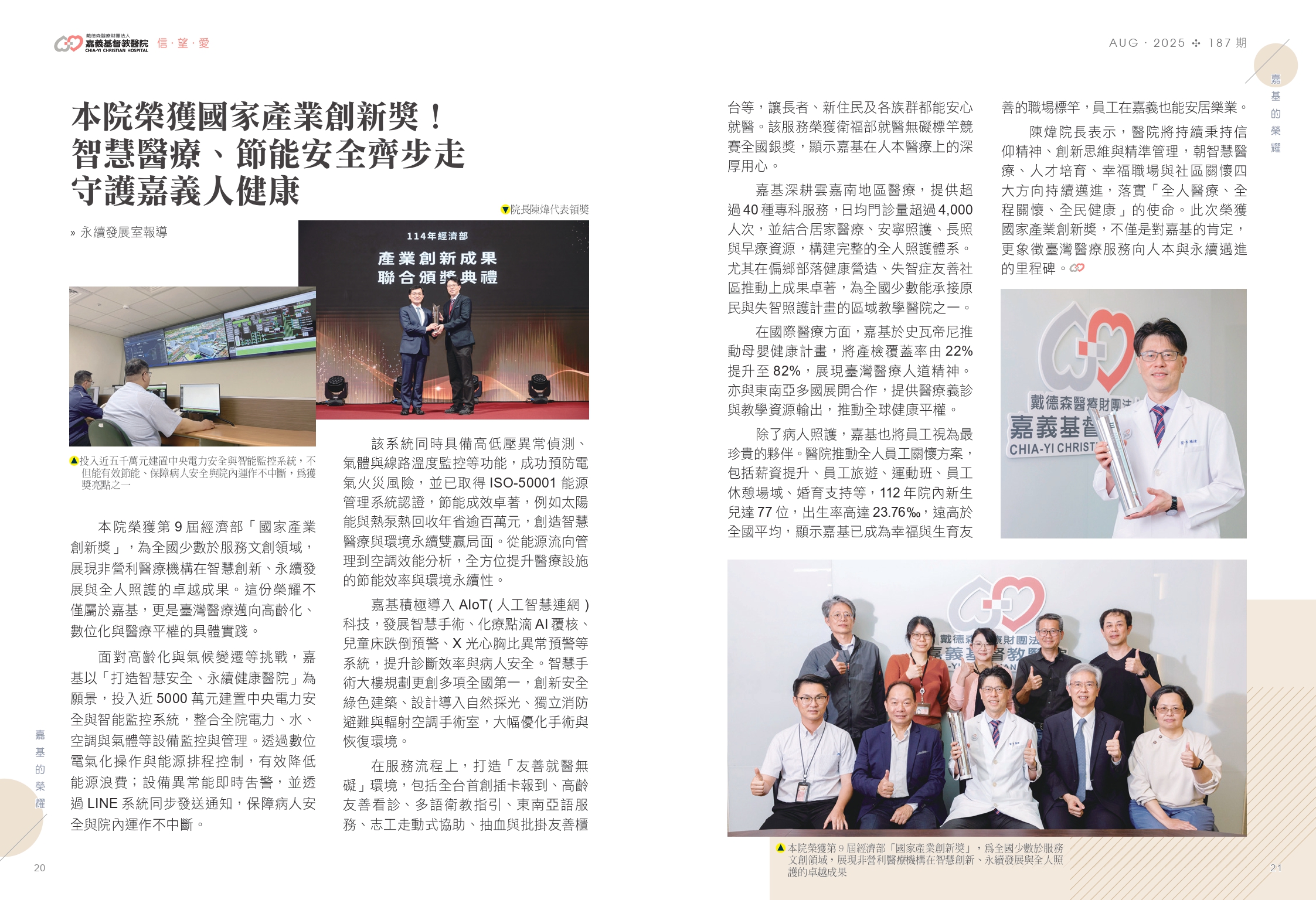 嘉基獲國家產業績優創新獎!智慧醫療、節能、社會關懷齊步走 守護嘉義人健康