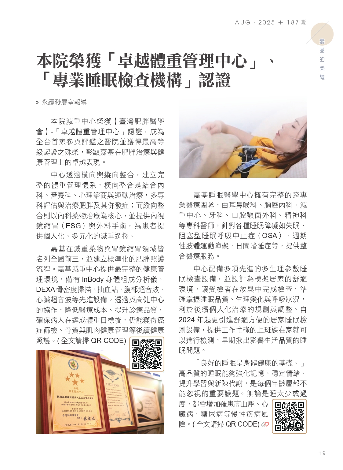 嘉基榮獲「卓越體重管理中心」、「專業睡眠檢查機構」認證