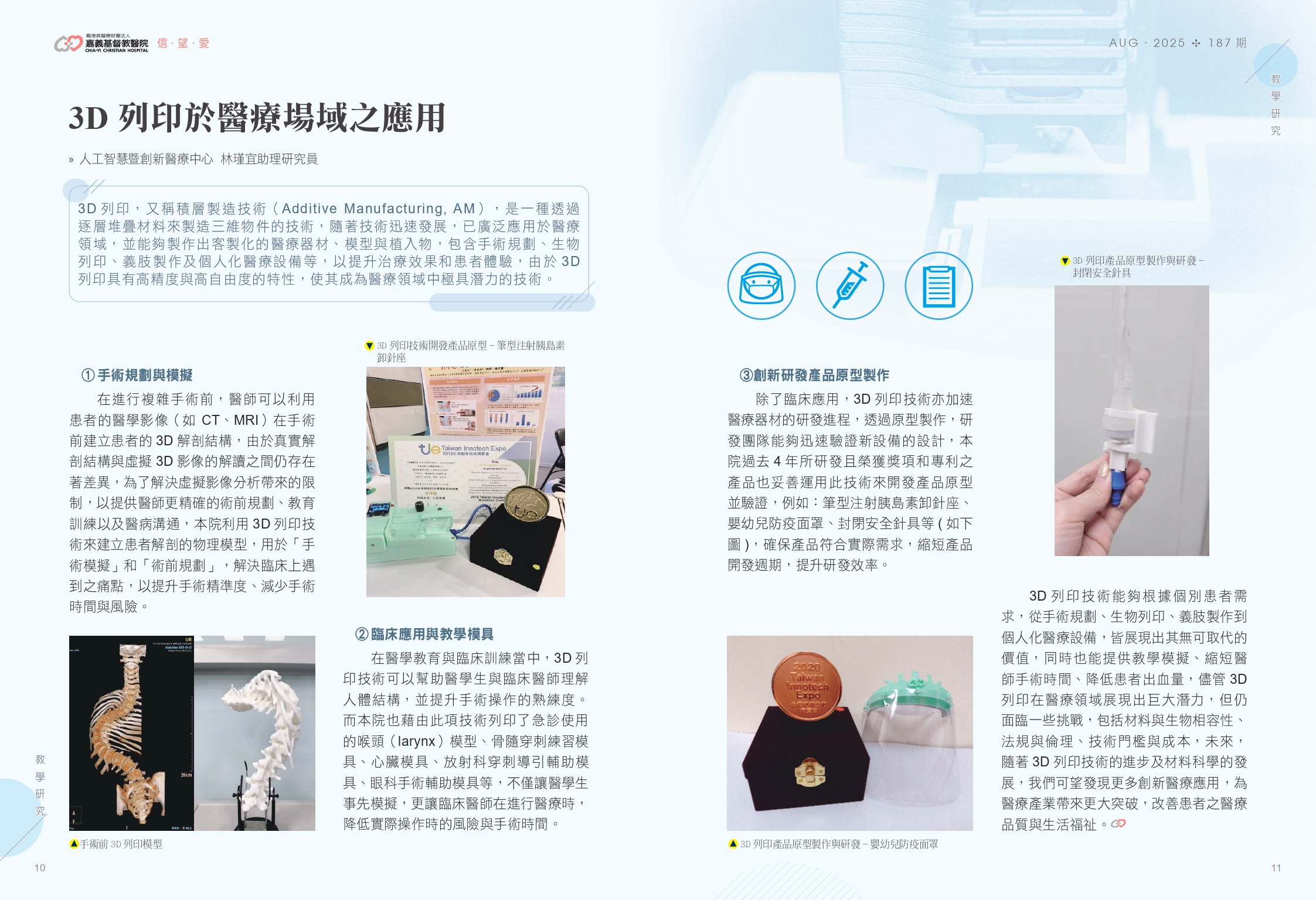 除了臨床應用,3D列印技術亦加速醫療器材的研發進程,透過原型製作,研發團隊能夠迅速驗證新設備的設計,本院過去4年所研發且榮獲獎項和專利之產品也妥善運用此技術來開發產品原型並驗證,例如:筆型注射胰島素卸針座、嬰幼兒防疫面罩、封閉安全針具等,確保產品符合實際需求,縮短產品開發週期,提升研發效率。