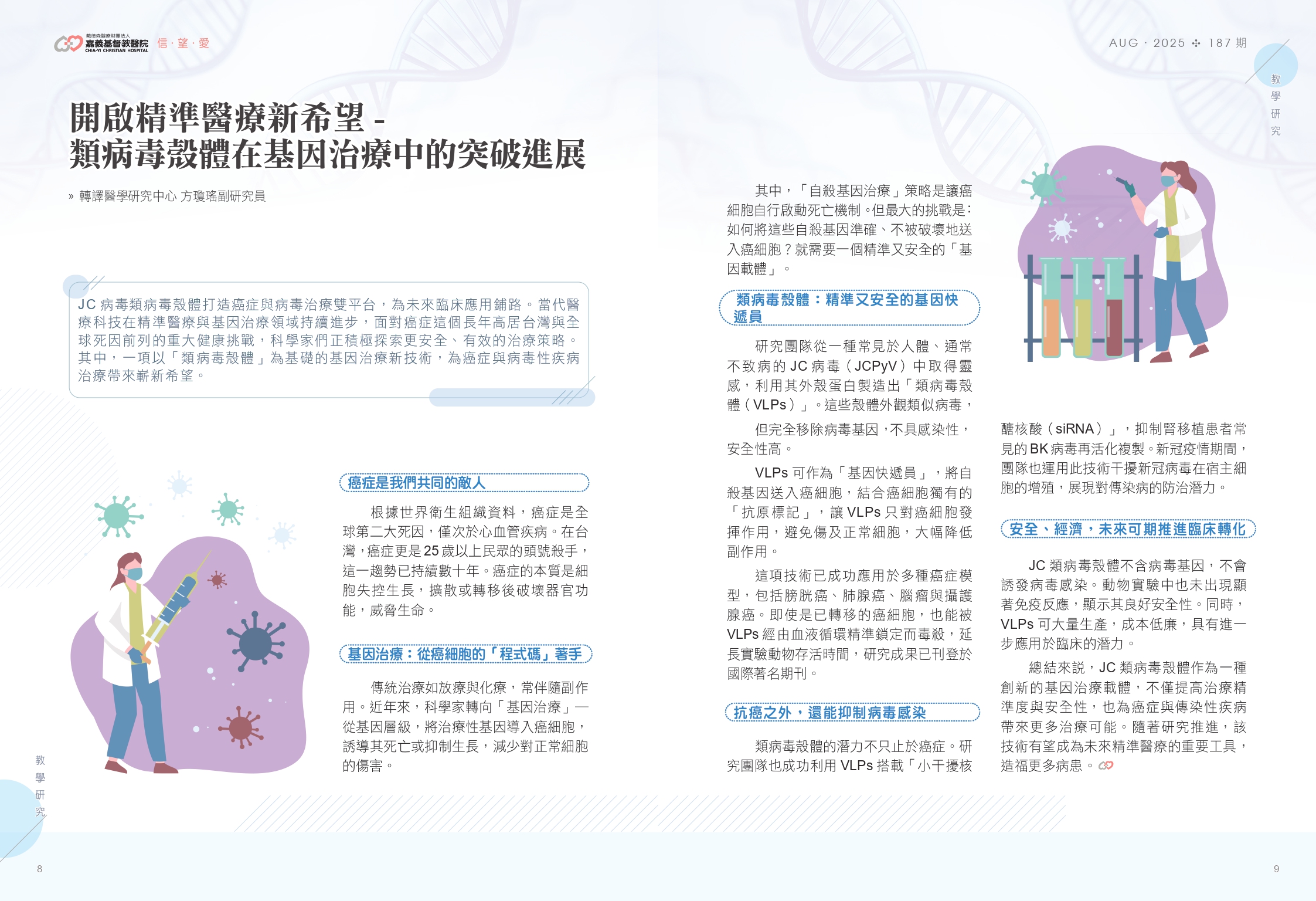 JC類病毒殼體作為一種創新的基因治療載體,不僅提高治療精準度與安全性,也為癌症與傳染性疾病帶來更多治療可能。隨著研究推進,該技術有望成為未來精準醫療的重要工具,造福更多病患。