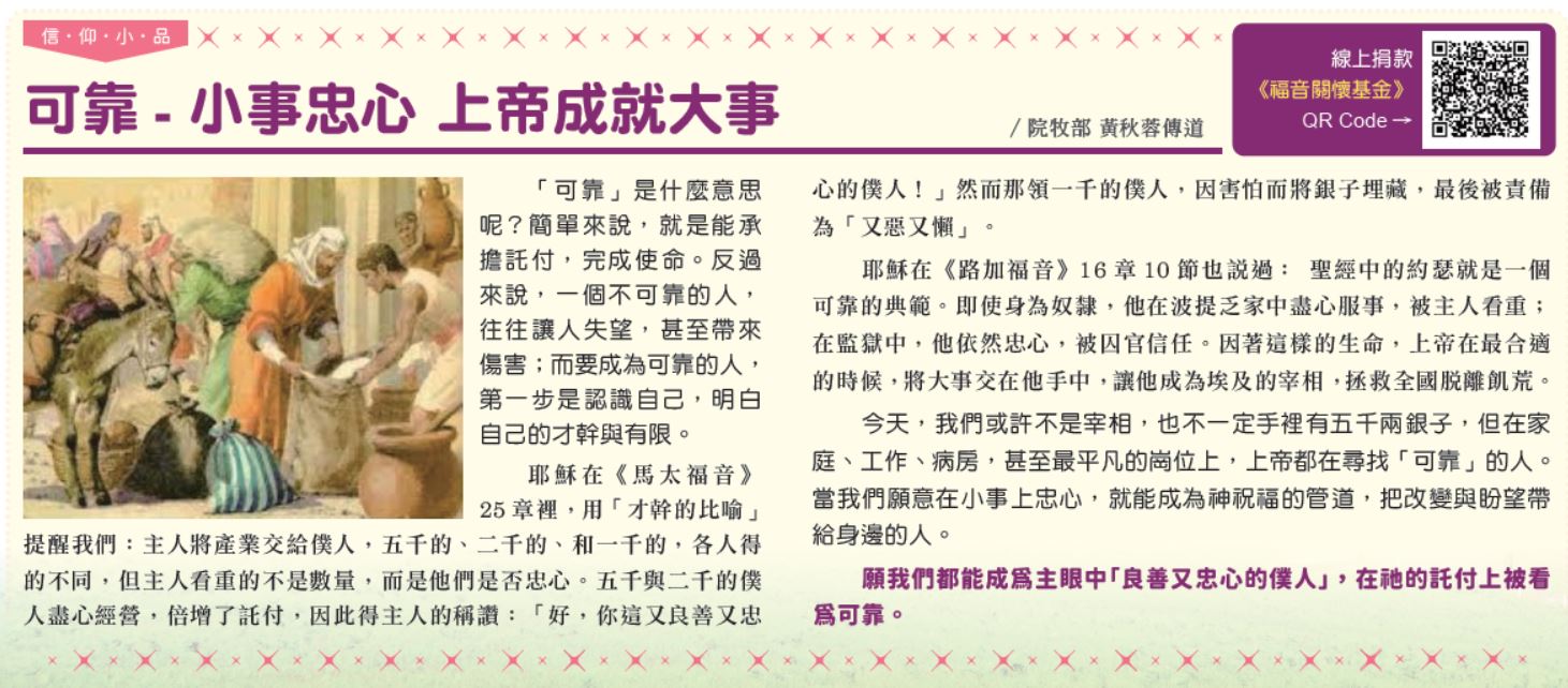 願我們都能成為主眼中「良善又忠心的僕人」,在祂的託付上被看為可靠。