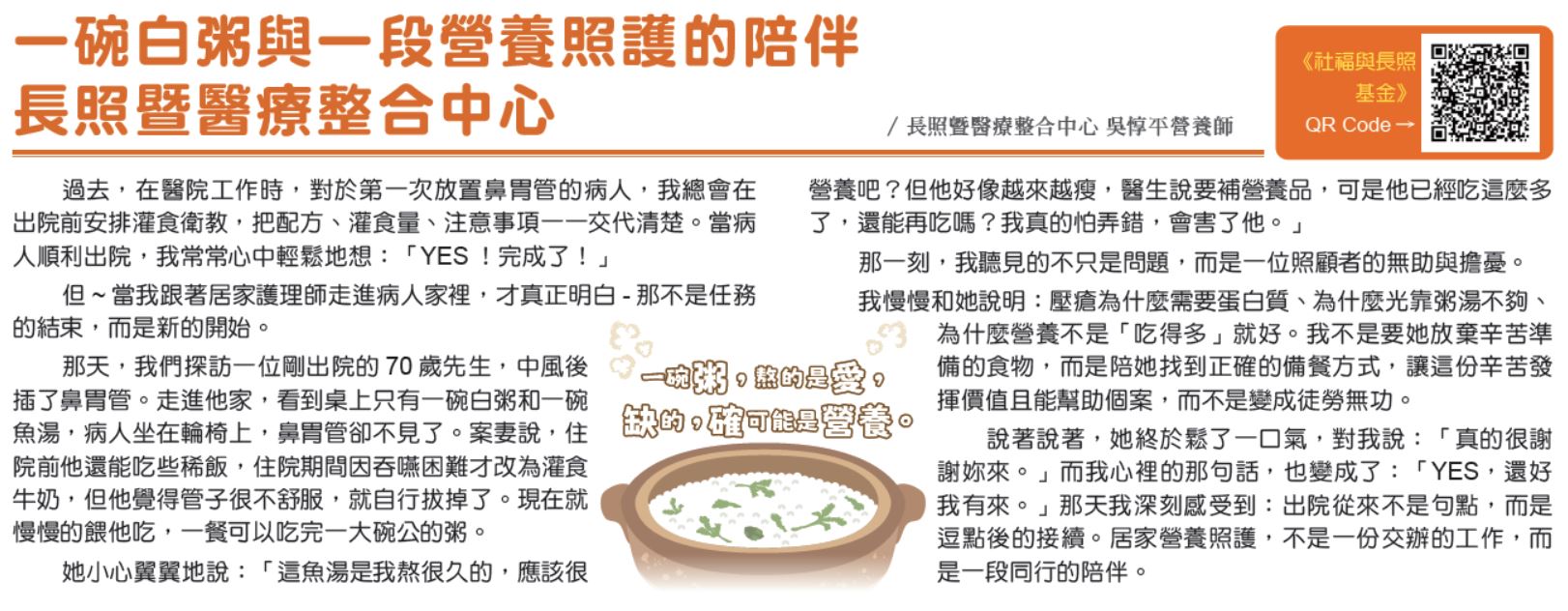 YES,還好我有來。」那天我深刻感受到:出院從來不是句點,而是逗點後的接續。居家營養照護,不是一份交辦的工作,而是一段同行的陪伴。