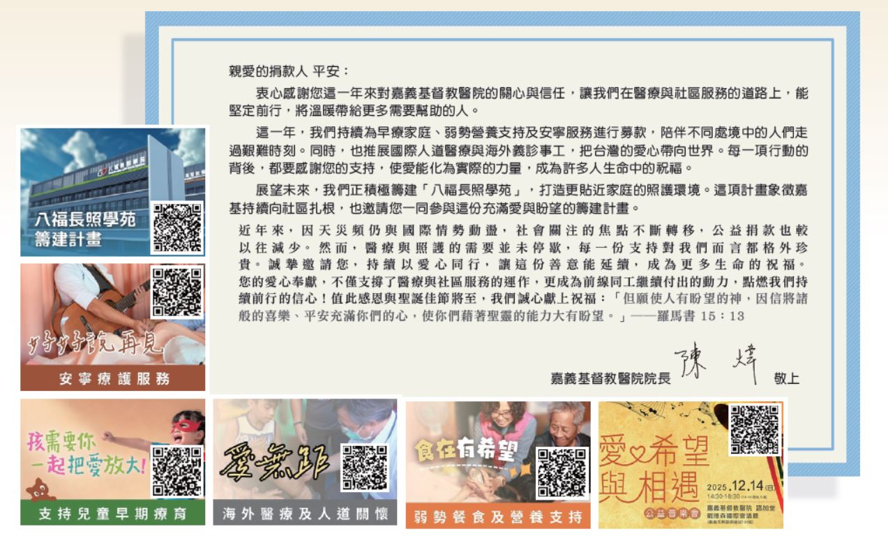 衷心感謝您這一年來對嘉義基督教醫院的關心與信任,讓我們在醫療與社區服務的道路上,能堅定前行,將溫暖帶給更多需要幫助的人。