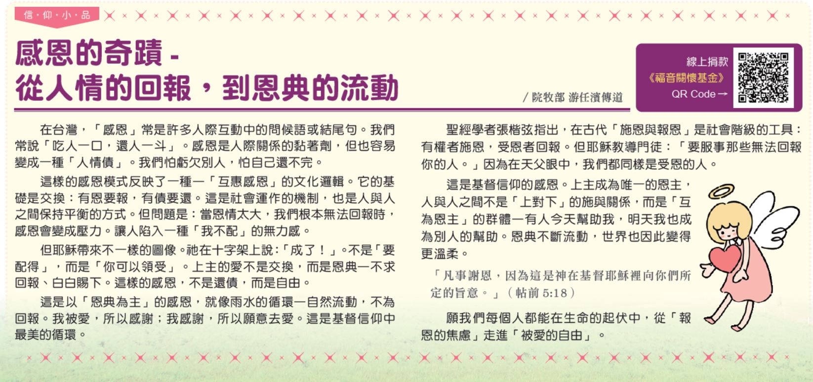 「凡事謝恩,因為這是神在基督耶穌裡向你們所定的旨意。」(帖前5:18)願我們每個人都能在生命的起伏中,從「報恩的焦慮」走進「被愛的自由」。