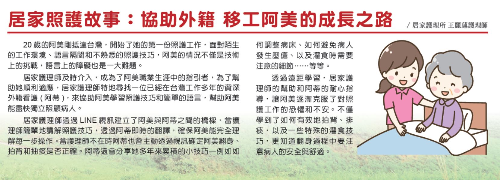 在這過程中,居家護理師的角色至關重要。除了協助聯繫資深看護即時翻譯和情感支持,為阿美提供了穩定的依靠,也為她提供了信心,讓她可以在每次遇到困難時都能得到解決。這不僅是技能上的提升,也是心靈上的支持。這樣的溝通和分享,不僅幫助了新來的外籍看護適應台灣的照護環境,也增強了她們之間的同事關係,共同提升居家照護的品質並讓每位外籍看護在陌生的環境中找到自己的位置,發揮最大潛力。