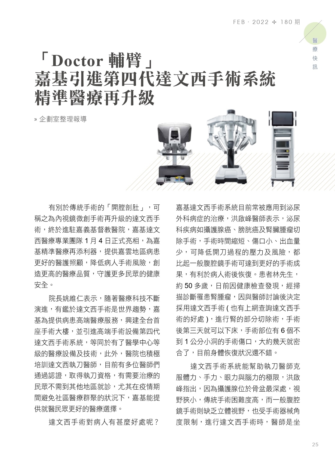 院長姚維仁表示,隨著醫療科技不斷演進,有鑑於達文西手術是世界趨勢,嘉基為提供病患嘉基高端醫療服務,興建全台首座手術的大樓,並引進高端手術設備達文西手術系統,等同於有了醫學中心等級的醫療設備及技術,此外,醫院也積極培訓達文西執刀醫師,目前有多位醫師們通過認證,取得執刀資格,有需要治療的民眾不需到其他地區就診,尤其在疫情期間避免社區醫療群聚的狀況下,嘉基能提供就醫民眾更好的醫療選擇。