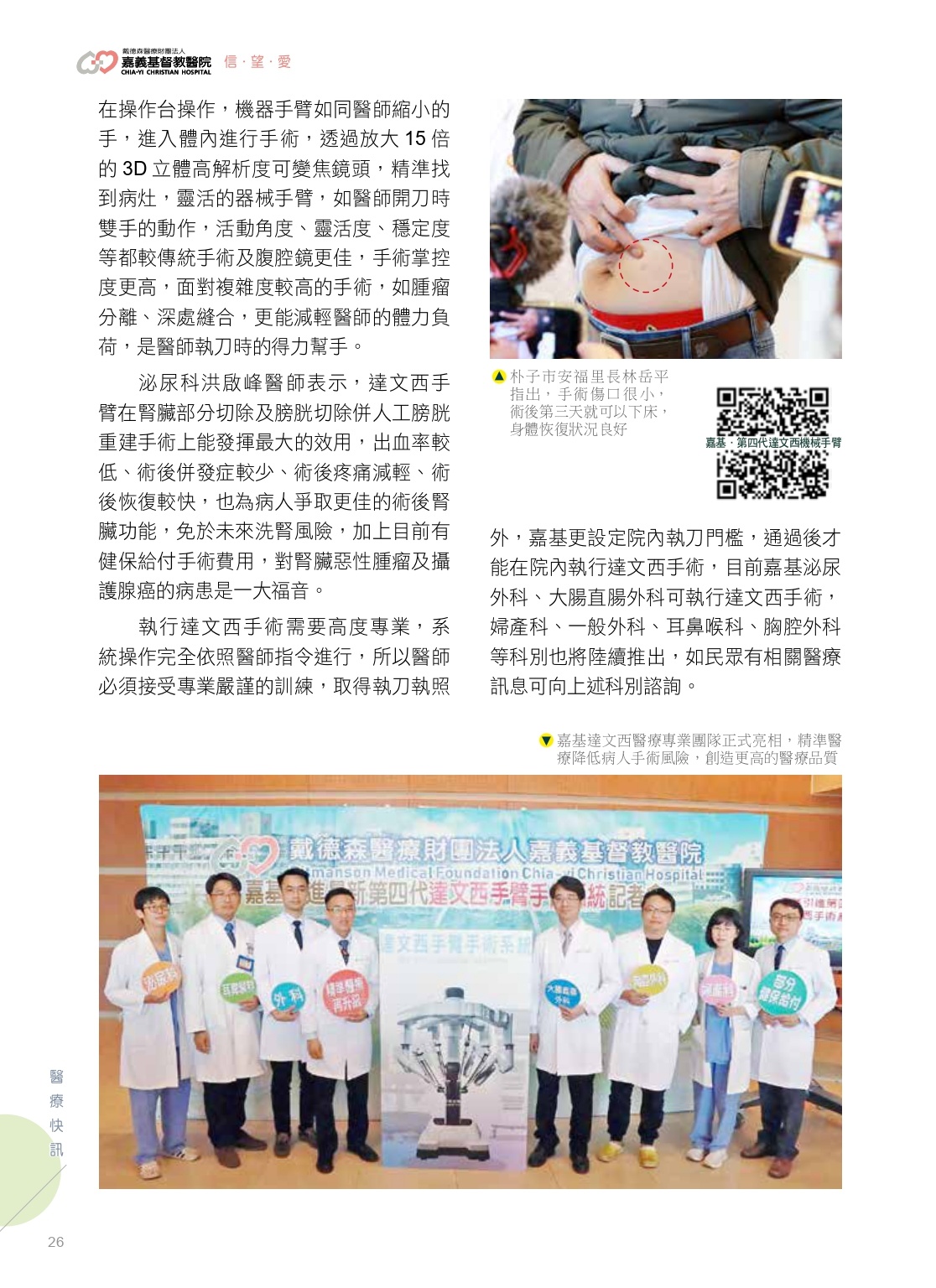 有別於傳統手術的「開膛剖肚」,可稱之為內視鏡微創手術再升級的達文西手術,終於進駐嘉義基督教醫院,嘉基達文西醫療專業團隊於1月4日正式亮相,為嘉基精準醫療再添利器,提供嘉雲地區病患更好的醫護照顧,降低病人手術風險,創造更高的醫療品質,守護更多民眾的健康安全。