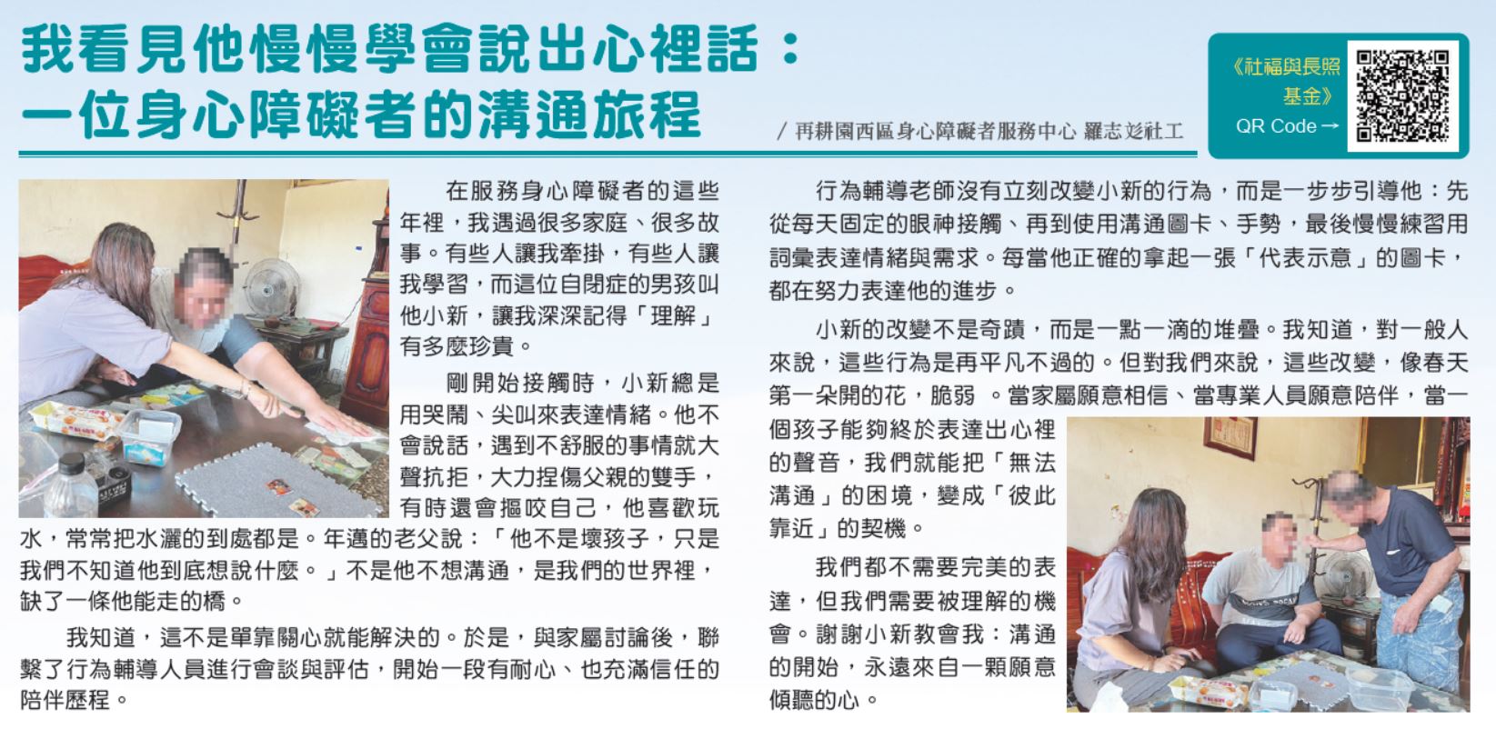 小新的改變不是奇蹟,而是一點一滴的堆疊。我知道,對一般人來說,這些行為是再平凡不過的。但對我們來說,這些改變,像春天第一朵開的花,脆弱卻讓人動容。當家屬願意相信、當專業人員願意陪伴,當一個孩子能夠終於表達出心裡的聲音,我們就能把「無法溝通」的困境,變成「彼此靠近」的契機。