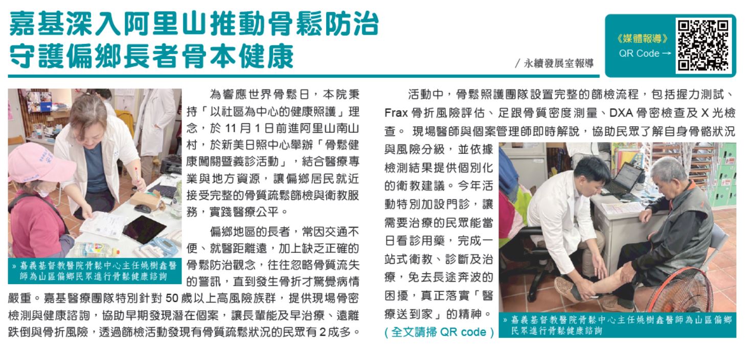 嘉基深入阿里山推動骨鬆防治 守護偏鄉長者骨本健康