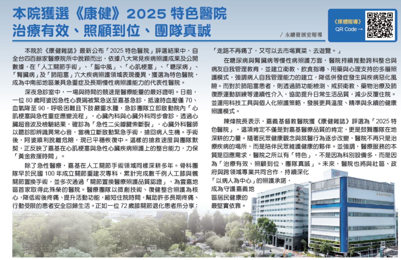 嘉基獲選《康健》2025特色醫院 治療有效、照顧到位、團隊真誠
