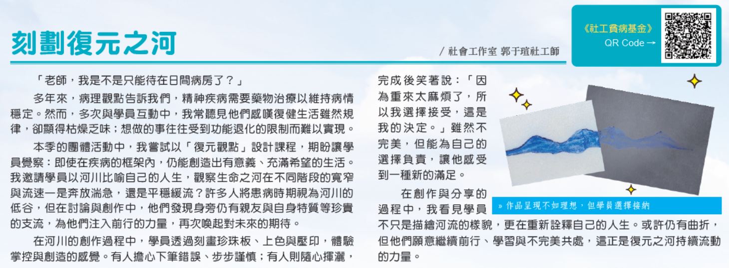 在創作與分享的過程中,我看見學員不只是描繪河流的樣貌,更在重新詮釋自己的人生。或許仍有曲折,但他們願意繼續前行、學習與不完美共處,這正是復元之河持續流動的力量。