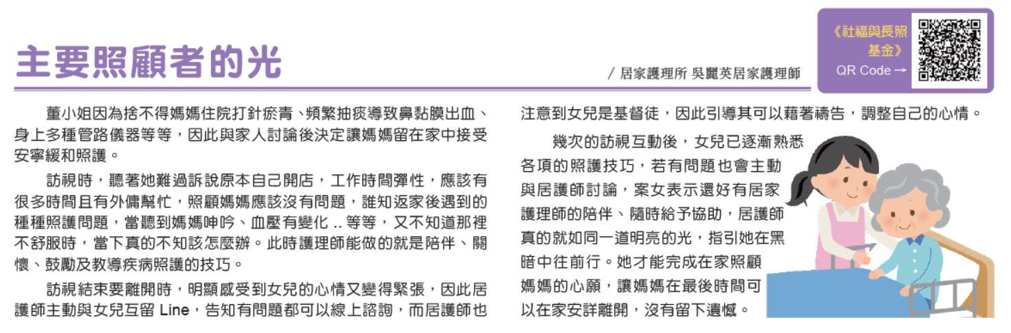幾次的訪視互動後,女兒已逐漸熟悉各項的照護技巧,若有問題也會主動與居護師討論,案女表示還好有居家護理師的陪伴、隨時給予協助,居護師真的就如同一道明亮的光,指引她在黑暗中往前行。她才能完成在家照顧媽媽的心願,讓媽媽在最後時間可以在家安詳離開,沒有留下遺憾。