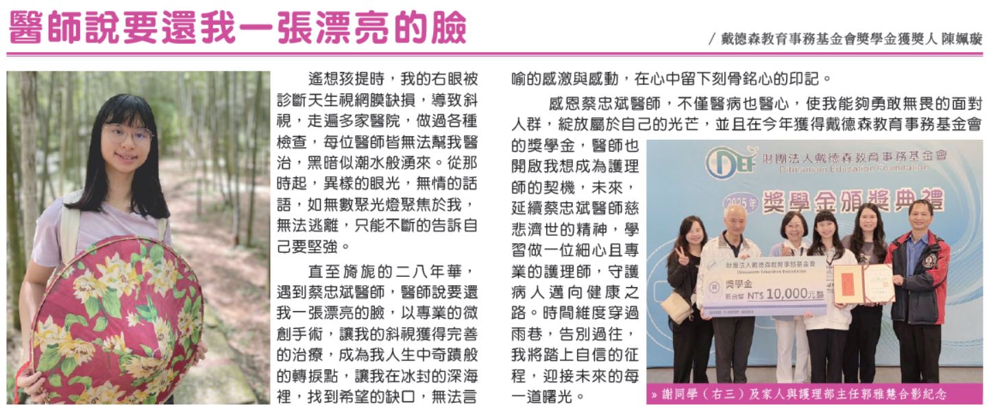 感恩蔡忠斌醫師,不僅醫病也醫心,使我能夠勇敢無畏的面對人群,綻放屬於自己的光芒,並且在今年獲得戴德森教育事務基金會的獎學金,醫師也開啟我想成為護理師的契機,未來,延續蔡忠斌醫師慈悲濟世的精神,學習做一位細心且專業的護理師,守護病人邁向健康之路。時間維度穿過雨巷,告別過往,我將踏上自信的征程,迎接未來的每一道曙光。