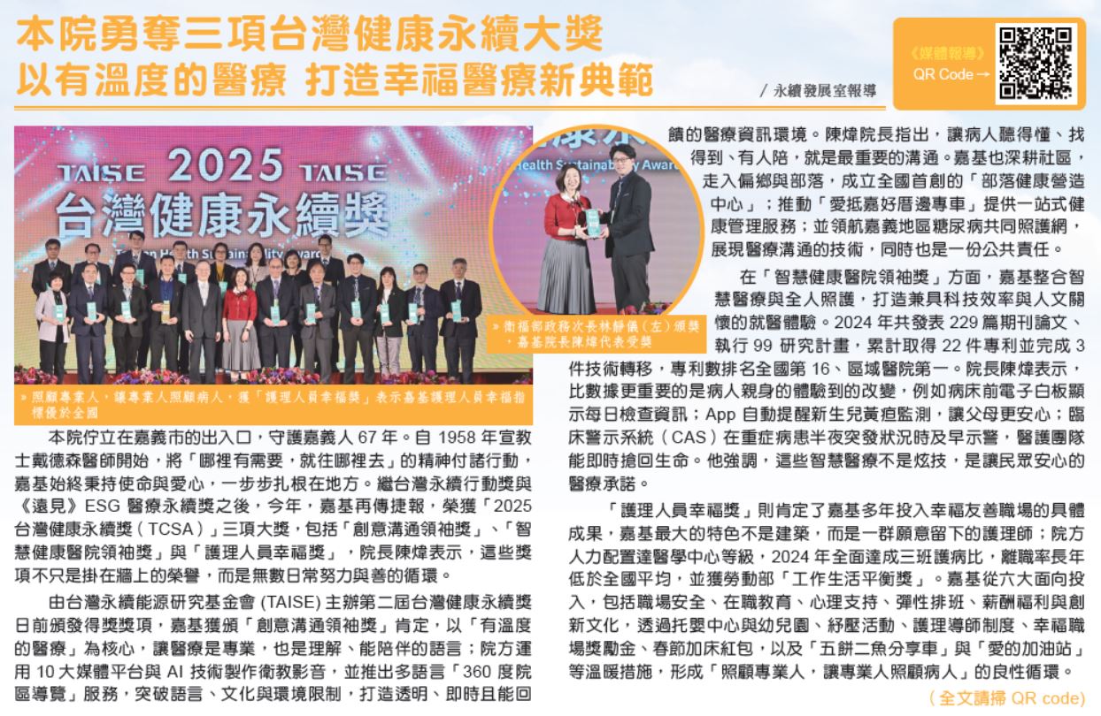 嘉基勇奪三項台灣健康永續大獎 以有溫度的醫療 打造幸福醫療新典範