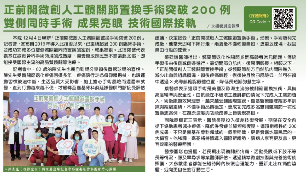 嘉基 正前開微創人工髖關節置換手術突破200例 技術國際接軌