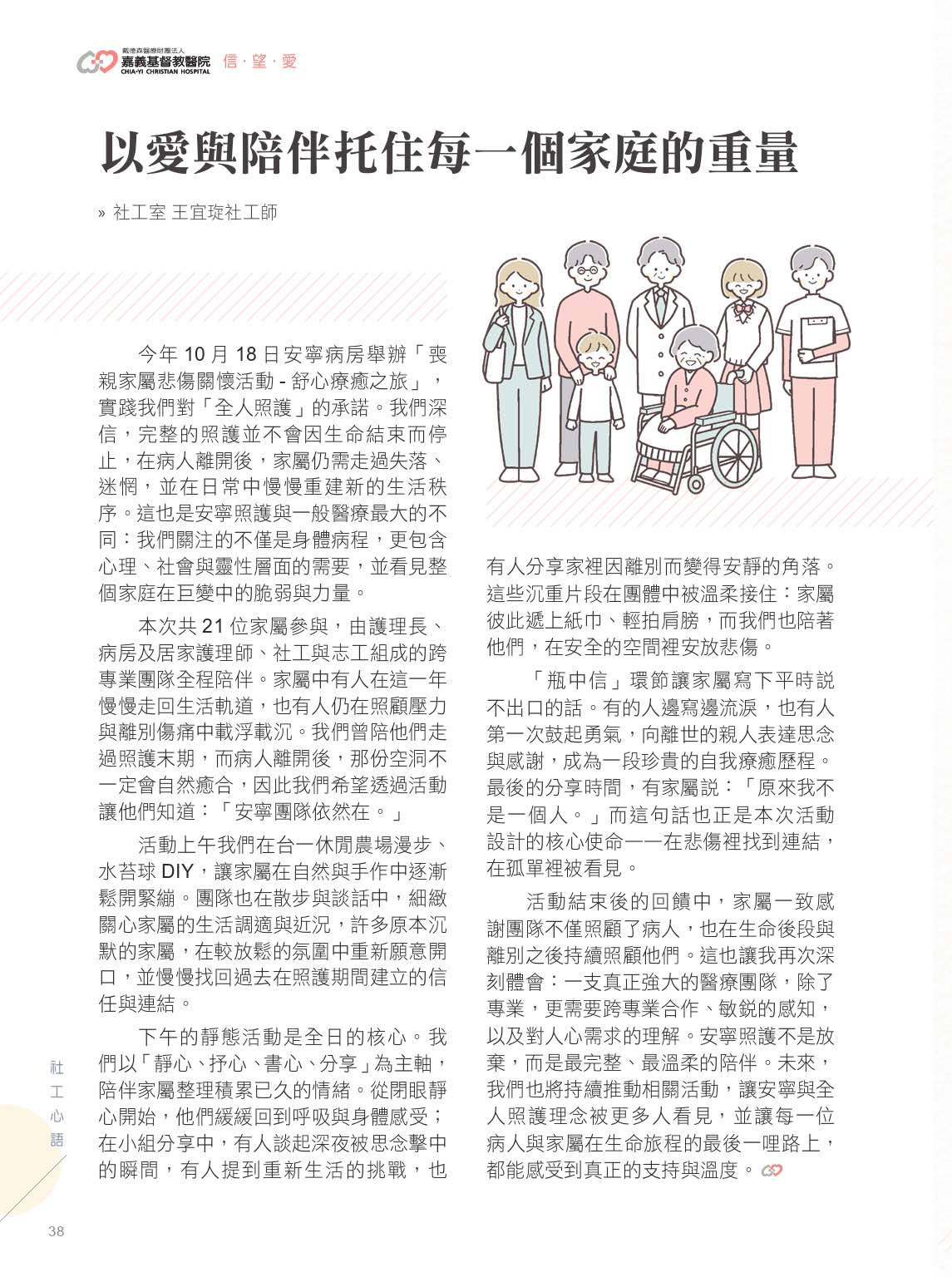 今年10月18日安寧病房舉辦「喪親家屬悲傷關懷活動-舒心療癒之旅」,實踐我們對「全人照護」的承諾。我們深信,完整的照護並不會因生命結束而停止,在病人離開後,家屬仍需走過失落、迷惘,並在日常中慢慢重建新的生活秩序。這也是安寧照護與一般醫療最大的不同:我們關注的不僅是身體病程,更包含心理、社會與靈性層面的需要,並看見整個家庭在巨變中的脆弱與力量。