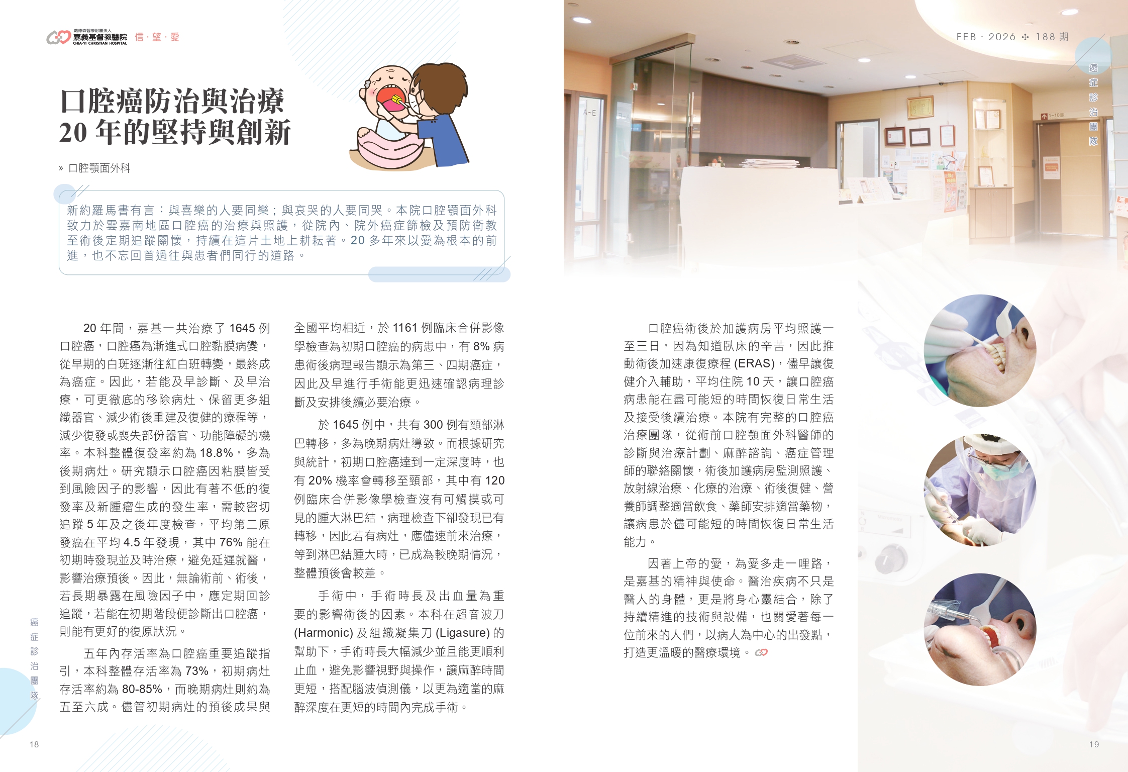 新約羅馬書有言:與喜樂的人要同樂; 與哀哭的人要同哭。本院口腔顎面外科致力於雲嘉南地區口腔癌的治療與照護,從院內、院外癌症篩檢及預防衛教至術後定期追蹤關懷,持續在這片土地上耕耘著。20多年來以愛為根本的前進,也不忘回首過往與患者們同行的道路。