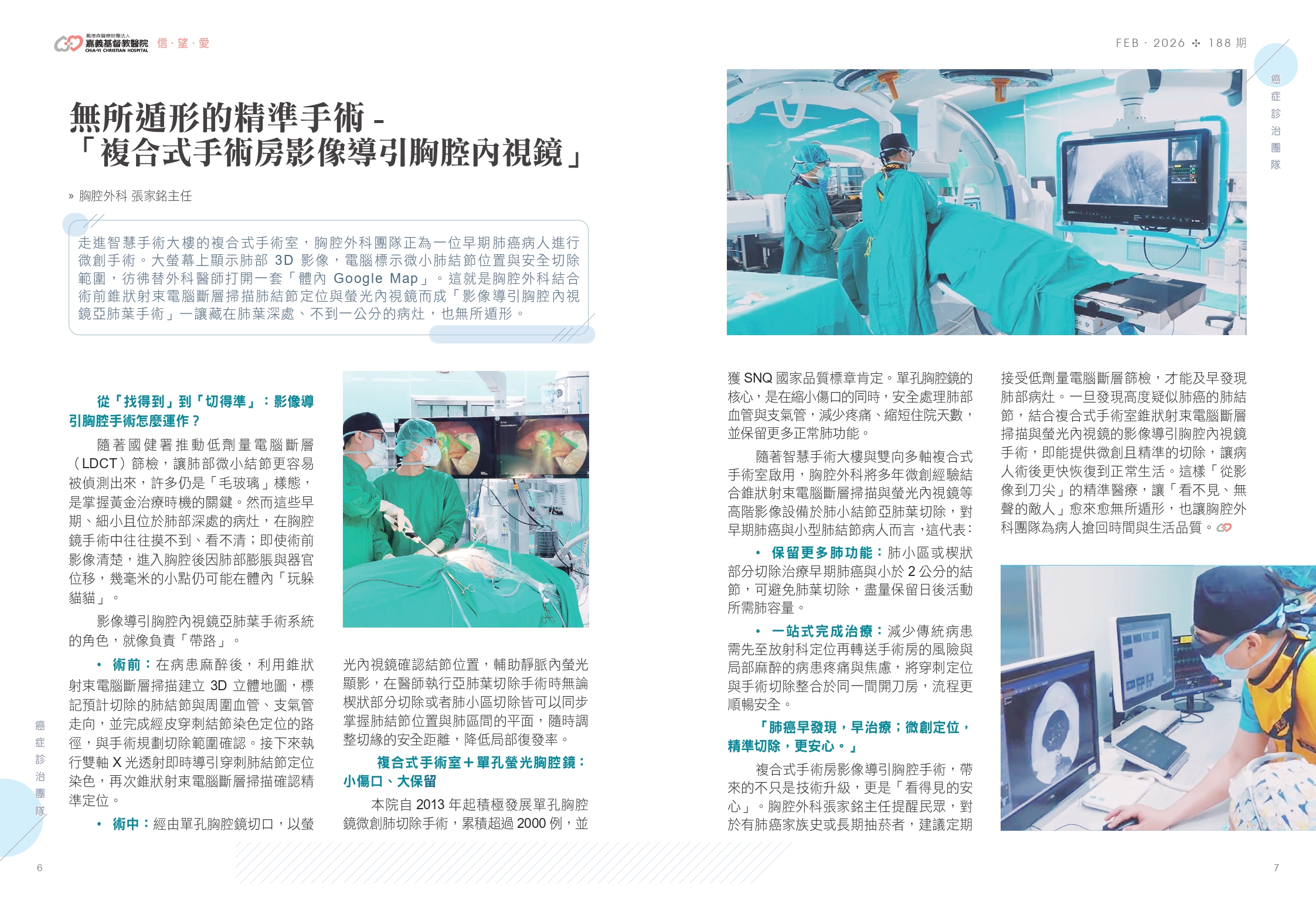 「肺癌早發現,早治療;微創定位,精準切除,更安心。」複合式手術房影像導引胸腔手術,帶來的不只是技術升級,更是「看得見的安心」。胸腔外科張家銘主任提醒民眾,對於有肺癌家族史或長期抽菸者,建議定期接受低劑量電腦斷層篩檢,才能及早發現肺部病灶。一旦發現高度疑似肺癌的肺結節,結合複合式手術室錐狀射束電腦斷層掃描與螢光內視鏡的影像導引胸腔內視鏡手術,即能提供微創且精準的切除,讓病人術後更快恢復到正常生活。這樣「從影像到刀尖」的精準醫療,讓「看不見、無聲的敵人」愈來愈無所遁形,也讓胸腔外科團隊為病人搶回時間與生活品質。