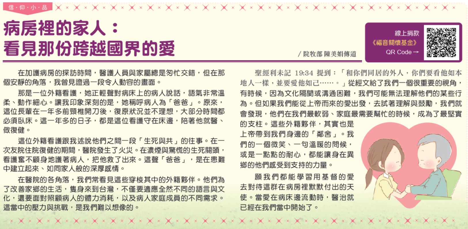 願我們都能學習用基督的愛去對待這群在病房裡默默付出的天使。當愛在病床邊流動時,醫治就已經在我們當中開始了。
