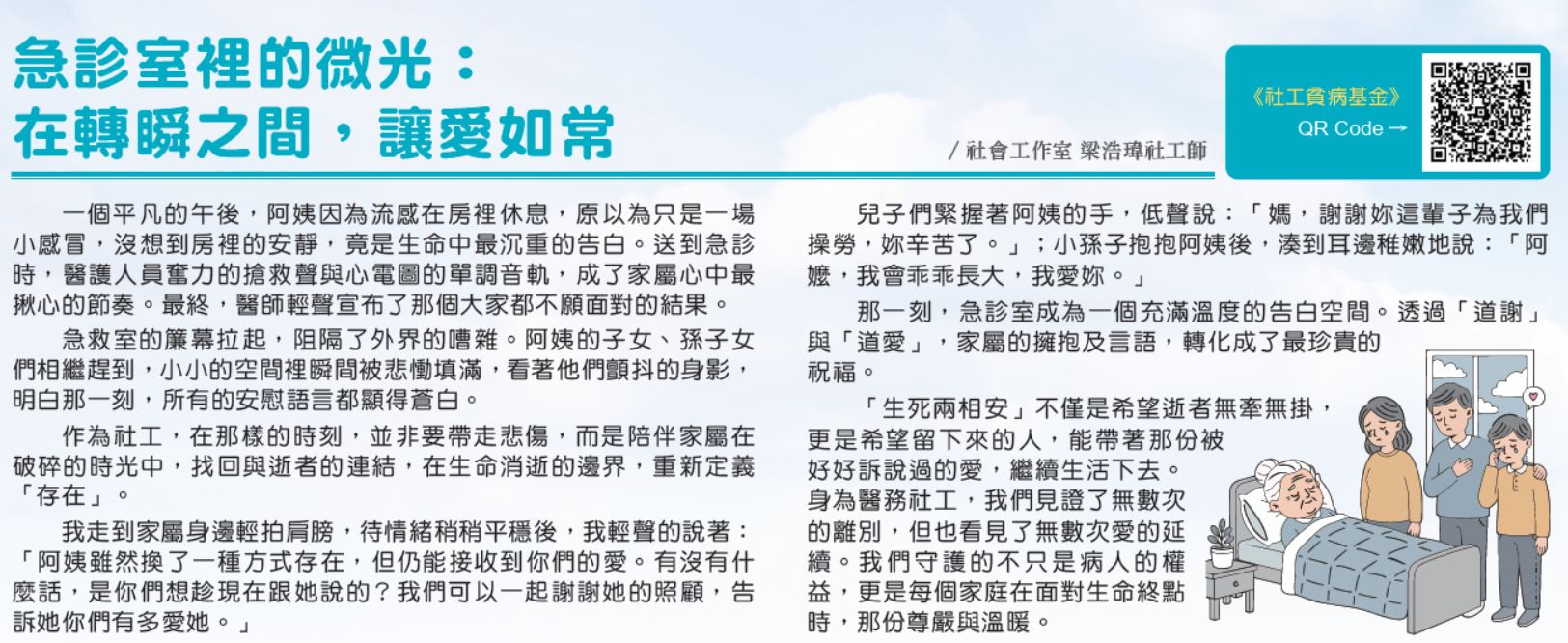 「生死兩相安」不僅是希望逝者無牽無掛,更是希望留下來的人,能帶著那份被好好訴說過的愛,繼續生活下去。身為醫務社工,我們見證了無數次的離別,但也看見了無數次愛的延續。我們守護的不只是病人的權益,更是每個家庭在面對生命終點時,那份尊嚴與溫暖。