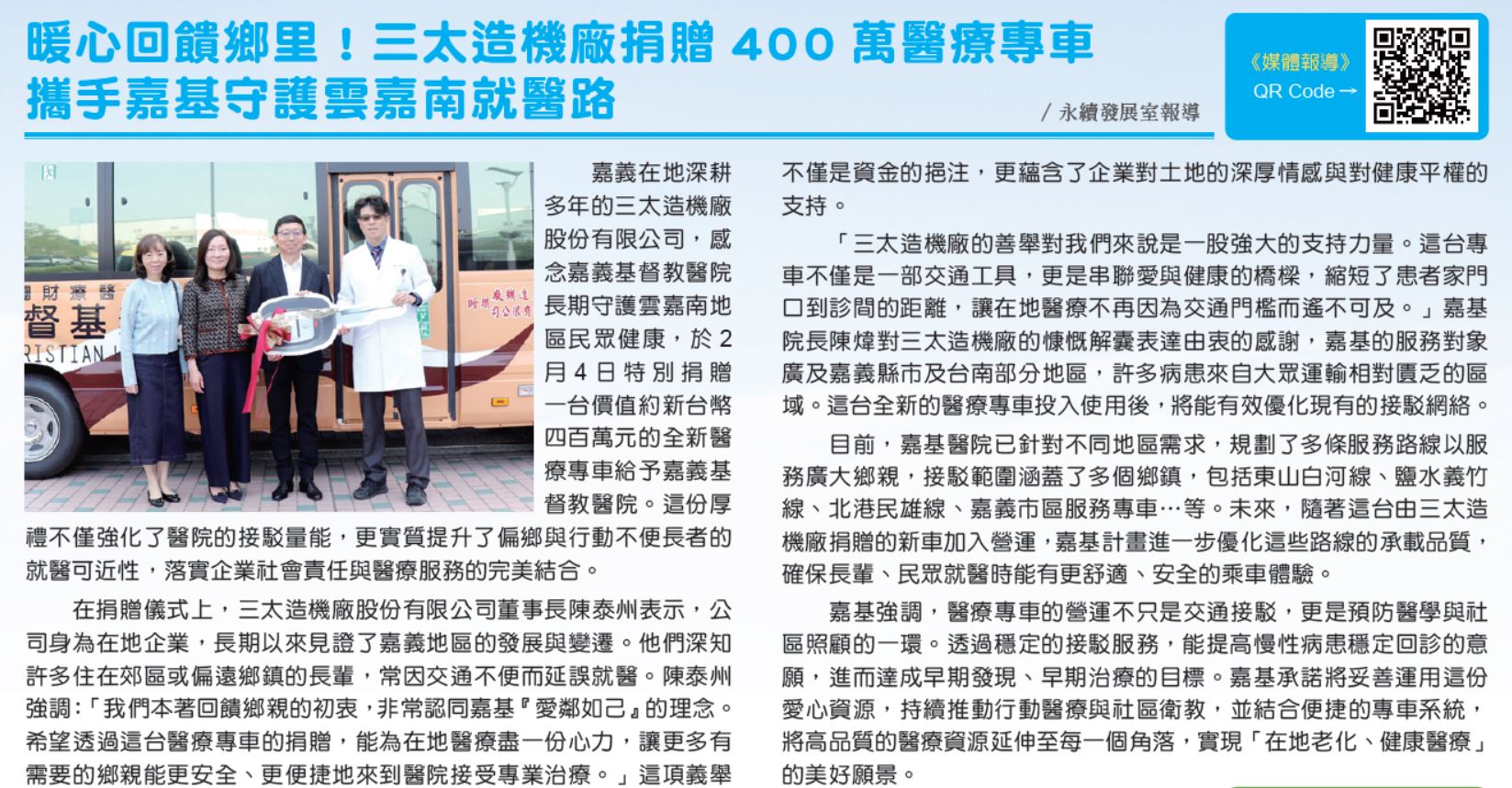 三太造機廠捐贈400萬醫療專車 攜手嘉基守護雲嘉南就醫路