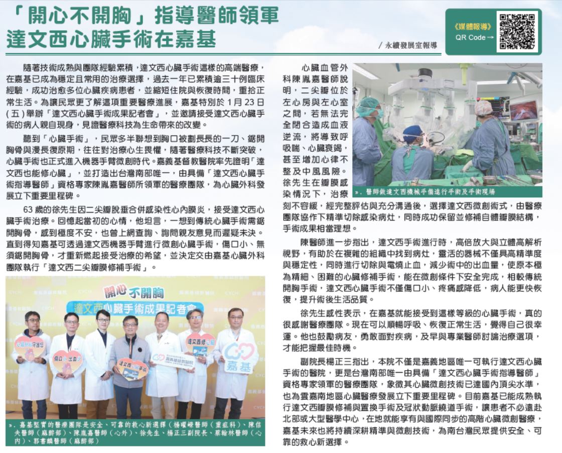 「開心不開胸」指導醫師領軍 達文西心臟手術在嘉基