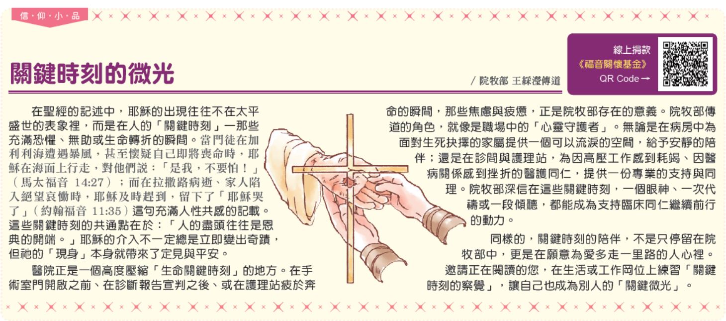同樣的,關鍵時刻的陪伴,不是只停留在院牧部中,更是在願意為愛多走一里路的人心裡。邀請正在閱讀的您,在生活或工作岡位上練習「關鍵時刻的察覺」,讓自己也成為別人的「關鍵微光」。