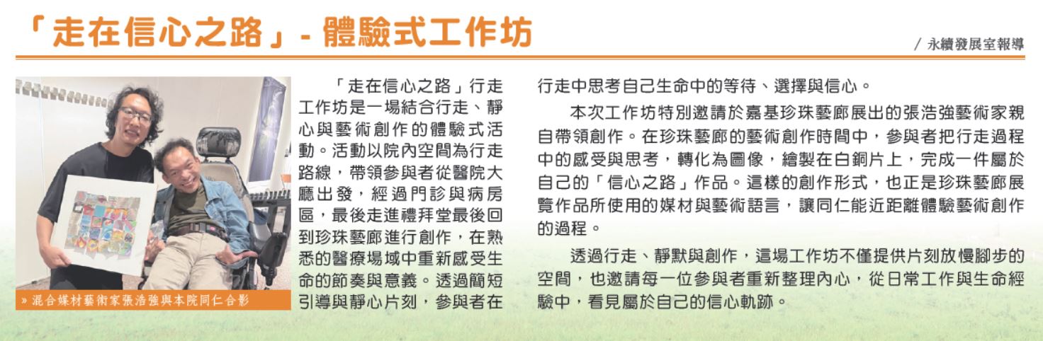 「走在信心之路」行走工作坊是一場結合行走、靜心與藝術創作的體驗式活動。活動以院內空間為行走路線,帶領參與者從醫院大廳出發,經過門診與病房區,最後走進禮拜堂最後回到珍珠藝廊進行創作,在熟悉的醫療場域中重新感受生命的節奏與意義。透過簡短引導與靜心片刻,參與者在行走中思考自己生命中的等待、選擇與信心。