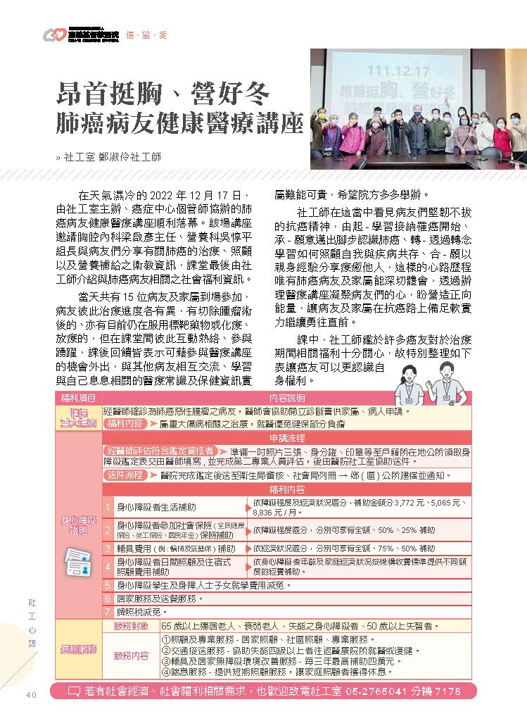 課中,社工師鑑於許多癌友對於治療期間相關福利十分關心,故特別整理如下表讓癌友可以更認識自身權利。未來,若有社會經濟、社會福利相關需求,也歡迎致電社工室05-2765041分機7178。
