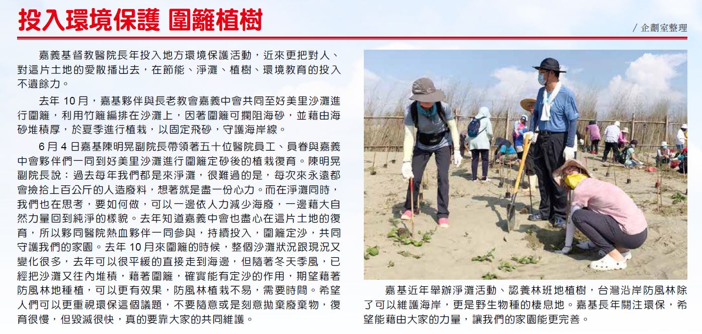 6月4日嘉基陳明晃副院長帶領著五十位醫院員工、員眷與嘉義中會夥伴們一同到好美里沙灘進行圍籬定砂後的植栽復育。陳明晃副院長說:過去每年我們都是來淨灘,很難過的是,每次來永遠都會撿拾上百公斤的人造廢料,想著就是盡一份心力。而在淨灘同時,我們也在思考,要如何做,可以一邊依人力減少海廢,一邊藉大自然力量回到純淨的樣貌。去年知道嘉義中會也盡心在這片土地的復育,所以夥同醫院熱血夥伴一同參與,持續投入,圍籬定沙,共同守護我們的家園。去年十月來圍籬的時候,整個沙灘狀況跟現況又變化很多,去年可以很平緩的直接走到海邊,但隨著冬天季風,已經把沙灘又往內堆積,藉著圍籬,確實能有定沙的作用,期望藉著防風林地種植,可以更有效果,防風林植栽不易,需要時間。希望人們可以更重視環保這個議題,不要隨意或是刻意拋棄廢棄物,復育很慢,但毀滅很快,真的要靠大家的共同維護。