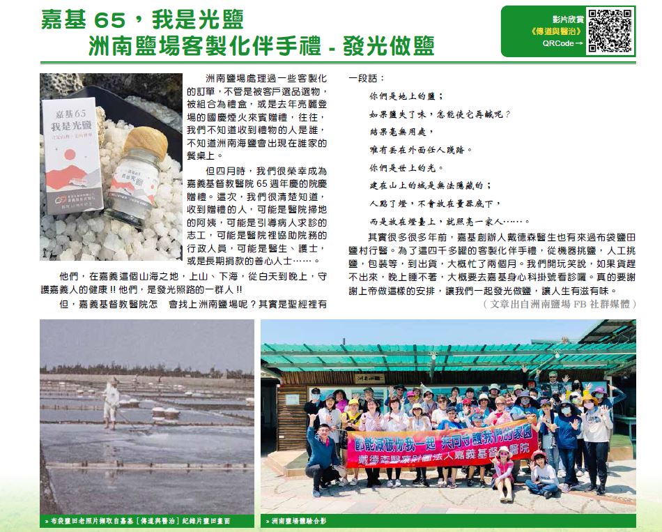 其實很多很多年前,嘉基創辦人戴德森醫生也有來過布袋鹽田鹽村行醫。為了這四千多罐的客製化伴手禮,從機器挑鹽,人工挑鹽,包裝等,到出貨,大概忙了兩個月。我們開玩笑說,如果貨趕不出來,晚上睡不著,大概要去嘉基身心科掛號看診囉。真的要謝謝上帝做這樣的安排,讓我們一起發光做鹽,讓人生有滋有味。