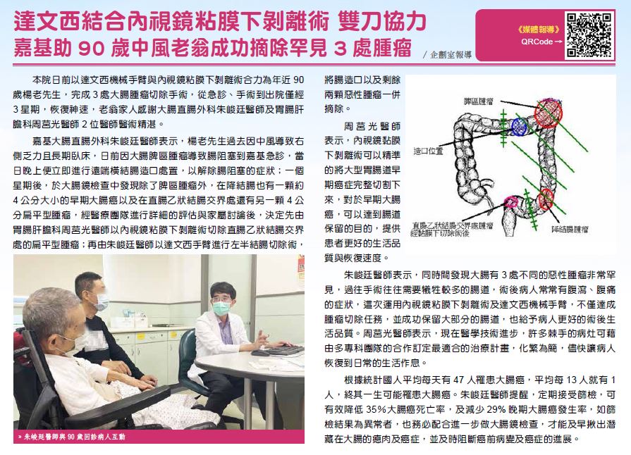 嘉基日前以達文西機械手臂與內視鏡粘膜下剝離術合力為年近90歲楊老先生,完成3處大腸腫瘤切除手術,從急診、手術到出院僅經3星期,恢復神速,老翁家人感謝大腸直腸外科朱峻廷醫師及胃腸肝膽科周莒光醫師2位醫師醫術精湛。