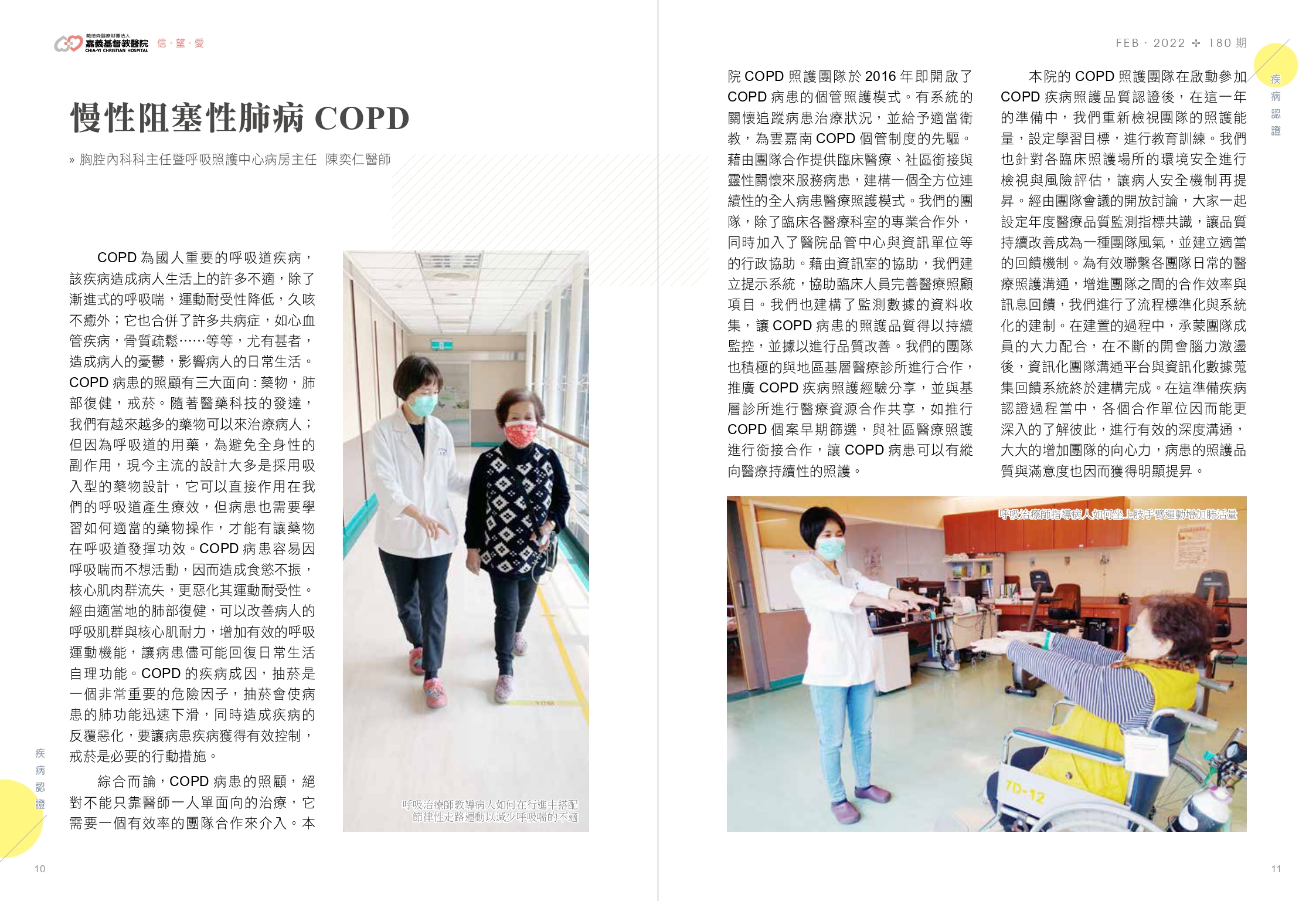 本院的COPD照護團隊在啟動參加COPD疾病照護品質認證後,在這一年的準備中,我們重新檢視團隊的照護能量,設定學習目標,進行教育訓練。我們也針對各臨床照護場所的環境安全進行檢視與風險評估,讓病人安全機制再提昇。經由團隊會議的開放討論,大家一起設定年度醫療品質監測指標共識,讓品質持續改善成為一種團隊風氣,並建立適當的回饋機制。為有效聯繫各團隊日常的醫療照護溝通,增進團隊之間的合作效率與訊息回饋,我們進行了流程標準化與系統化的建制。在建置的過程中,承蒙團隊成員的大力配合,在不斷的開會腦力激盪後,資訊化團隊溝通平台與資訊化數據蒐集回饋系統終於建構完成。在這準備疾病認證過程當中,各個合作單位因而能更深入的了解彼此,進行有效的深度溝通,大大的增加團隊的向心力,病患的照護品質與滿意度也因而獲得明顯提昇。