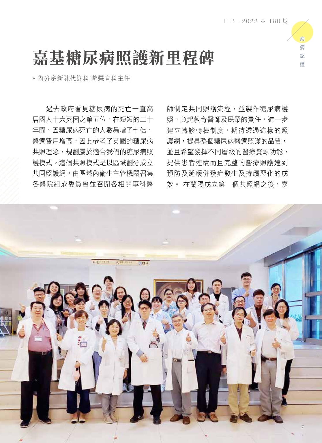 過去政府看見糖尿病的死亡一直高居國人十大死因之第五位,在短短的二十年間,因糖尿病死亡的人數暴增了七倍,醫療費用增高,因此參考了英國的糖尿病共照理念,規劃屬於適合我們的糖尿病照護模式。這個共照模式是以區域劃分成立共同照護網,由區域內衛生主管機關召集各醫院組成委員會並召開各相關專科醫師制定共同照護流程並製作糖尿病護照,負起教育醫師及民眾的責任,進一步建立轉診轉檢制度,期待透過這樣的照護網,提昇整個糖尿病醫療照護的品質,並且希望發揮不同層級的醫療資源功能,提供患者連續而且完整的醫療照護達到預防及延緩併發症發生及持續惡化的成效。 在蘭陽成立第一個共照網,嘉義也於民國八十七年組成規劃小組,成立『嘉義地區糖尿病共同照護網』,開始推動糖尿病共同照護計畫,當時由嘉基盧介祥醫師擔任計畫協同主持人。我於民國九十一年來到嘉基,有幸參與了許多教育訓練的工作,也到基層醫療院所訪視,了解他們照護糖尿病的問題,並提供專科建議,鼓勵基層醫師加入共照網。