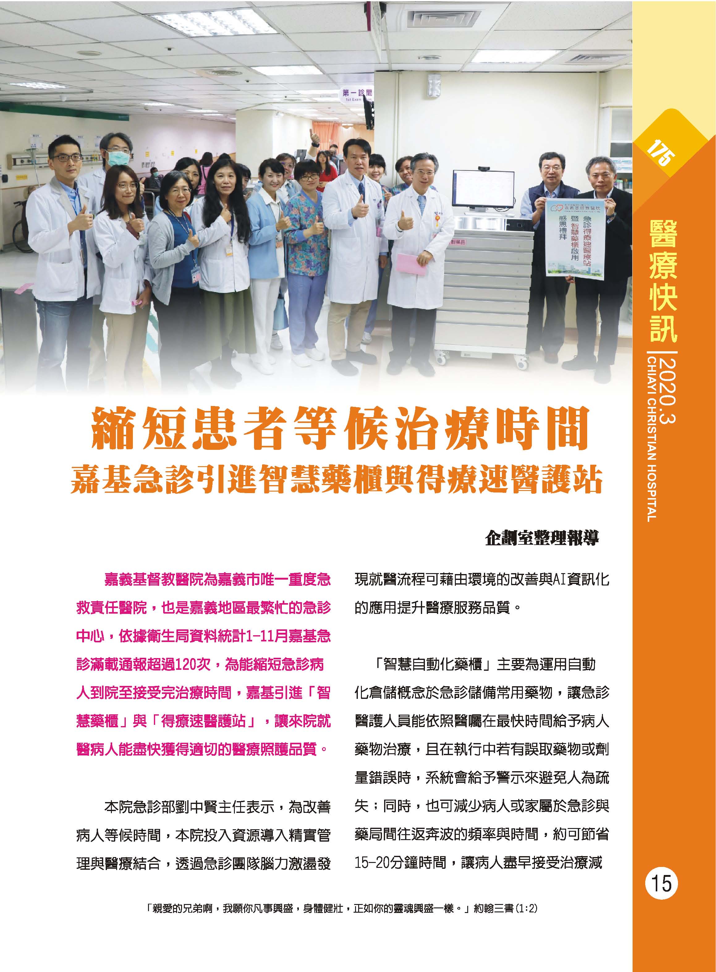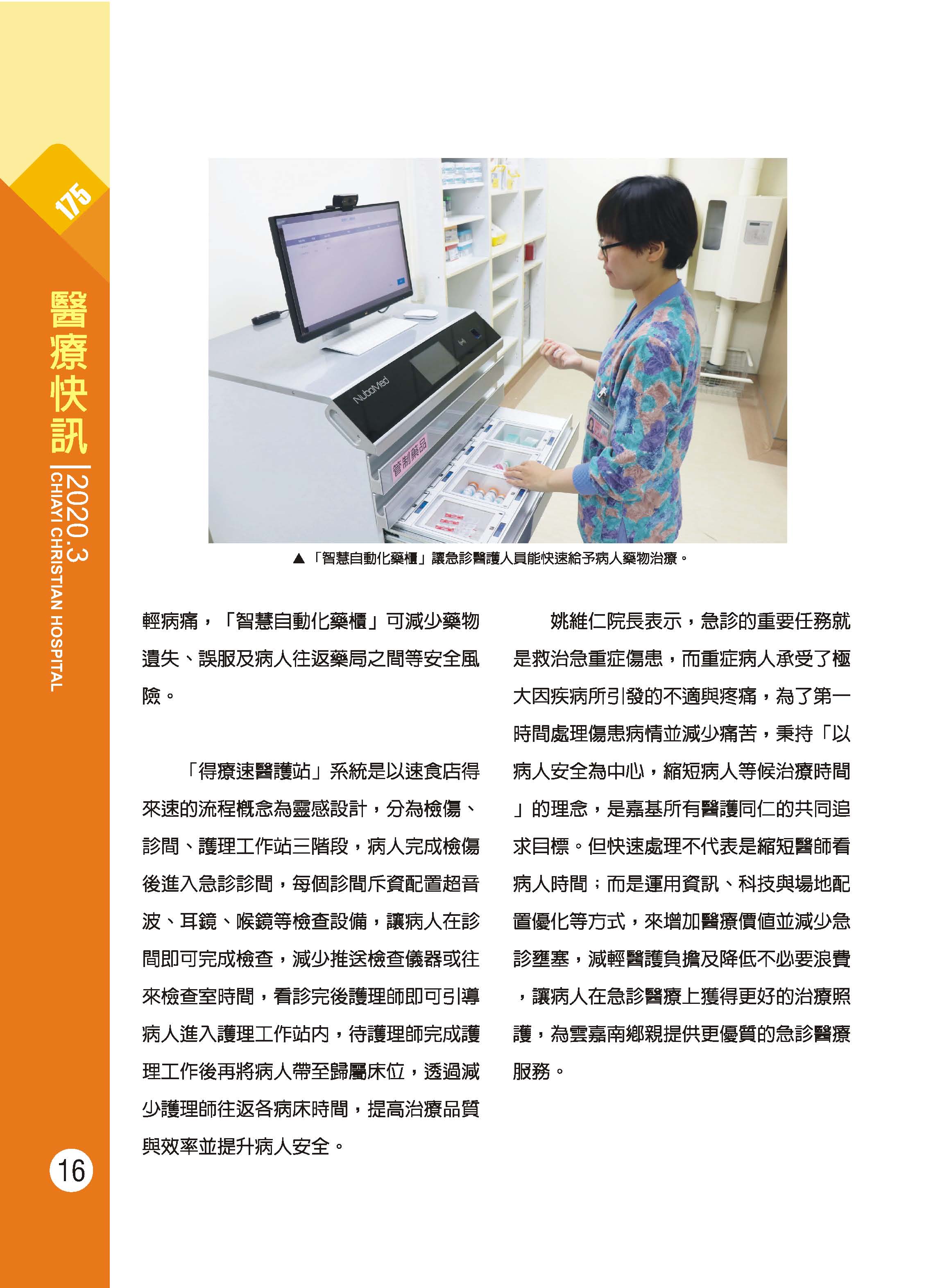 縮短患者等候治療時間 嘉基急診引進智慧藥櫃與得療速醫護站