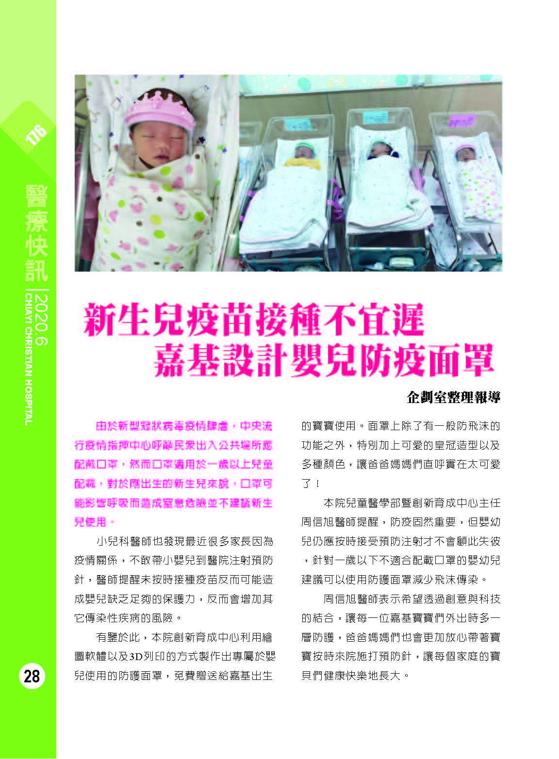 新生兒疫苗接種不宜遲 嘉基設計嬰兒防疫面罩