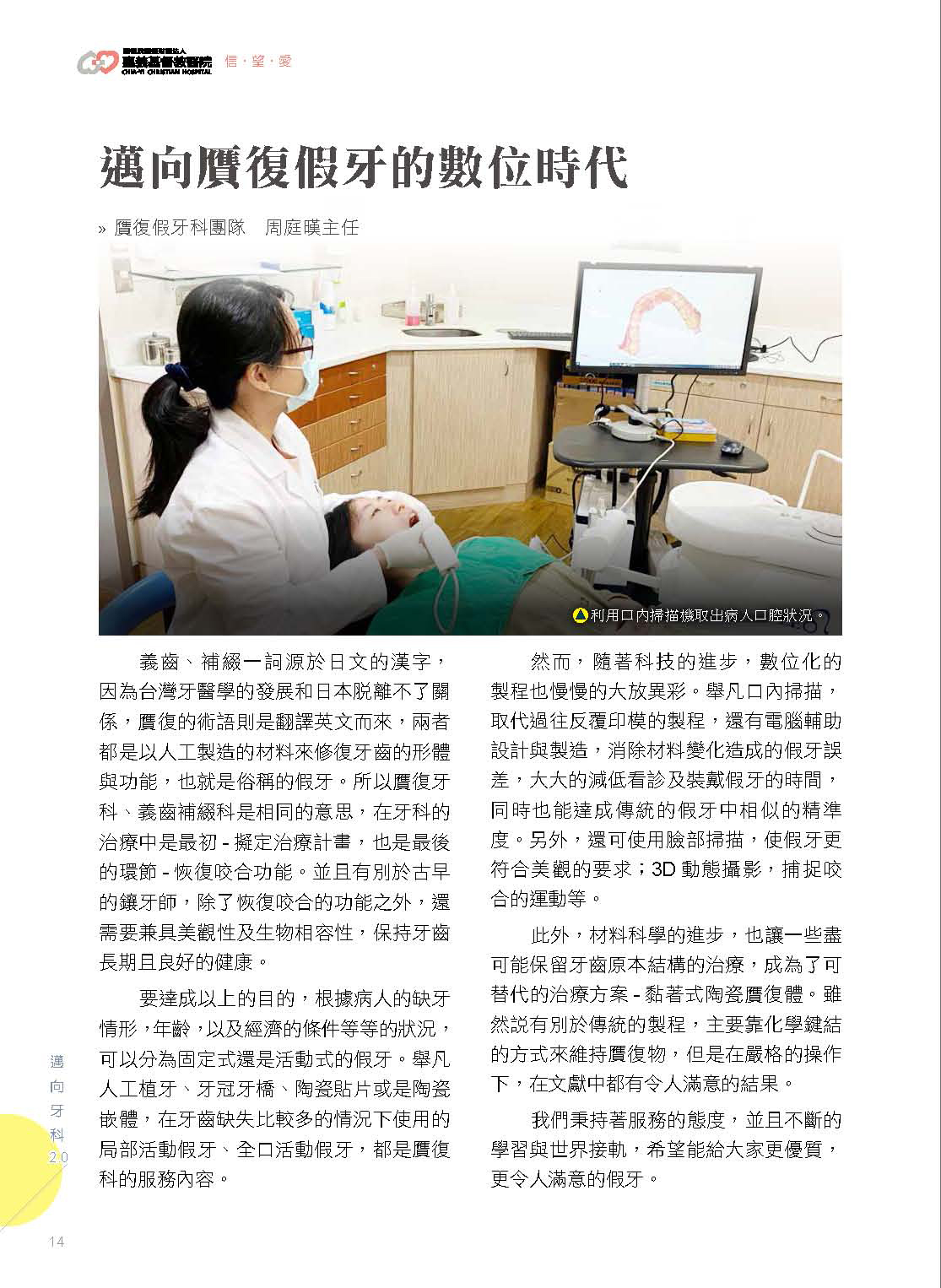 然而,隨著科技的進步,數位化的製程也慢慢的大放異彩。舉凡口內掃描,取代過往反覆印模的製程,還有電腦輔助設計與製造,消除材料變化造成的假牙誤差,大大的減低看診及裝戴假牙的時間,同時也能達成傳統的假牙中相似的精準度。另外,還可使用臉部掃描,使假牙更符合美觀的要求;3D動態攝影,捕捉咬合的運動等。