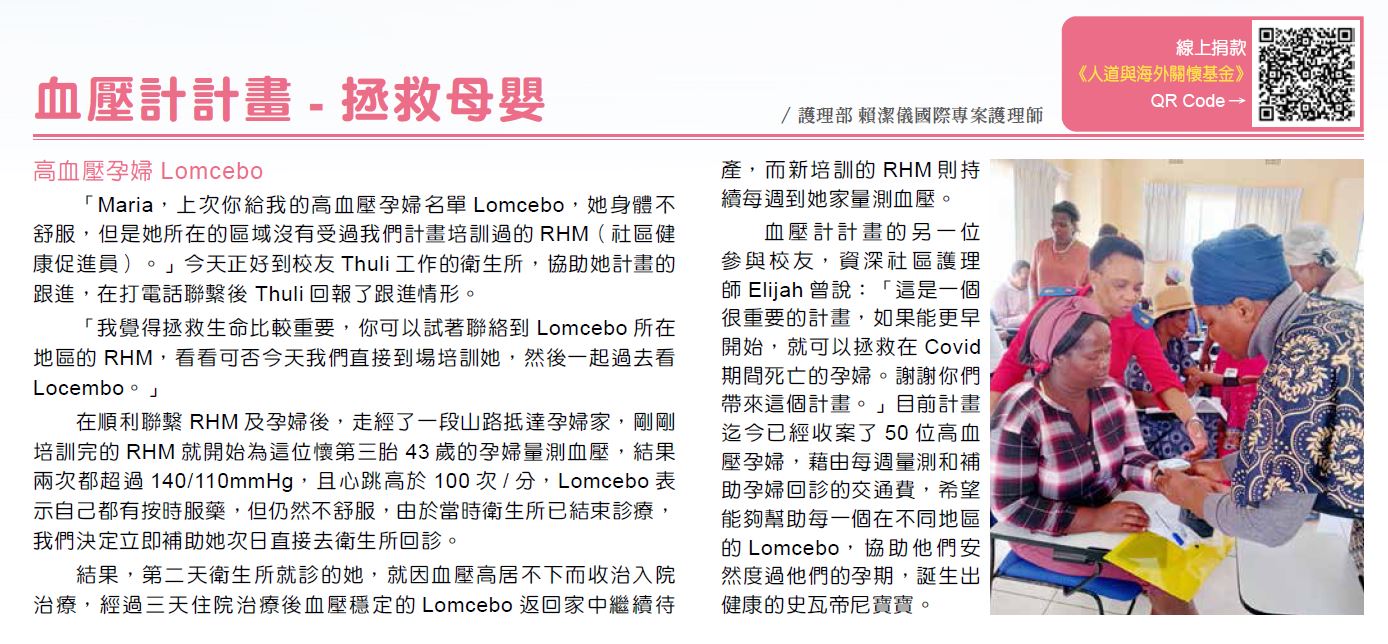 血壓計計畫的另一位參與校友, 資深社區護理師Elijah 曾說:「這是一個很重要的計畫,如果能更早開始,就可以拯救在Covid期間死亡的孕婦。謝謝你們帶來這個計畫。」目前計畫迄今已經收案了50 位高血壓孕婦,藉由每週量測和補助孕婦回診的交通費,希望能夠幫助每一個在不同地區的Lomcebo, 協助他們安然度過他們的孕期,誕生出健康的史瓦帝尼寶寶。